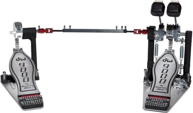 9000 Series Double pedal. Features: Ball bearing Delta hinge – Double ball bearing spring suspension – Ball bearing axle and stick unit – Single post slave pedal – Precision linkage assembly – Hoop fixation accessible from the side – Two way beater felt/plastic – Infinitely adjustment between round and eccentric gearwheel – Including hardnylon bag – Tri Pivot hoop clamp – Floor plate with anti-slip rubber