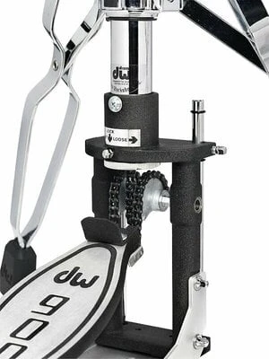 9000 series hi hat stand. Features: Turbo sprocket double chain drive, radius rod for cymbal angle setting, ball bearing Delta hinge, two rotatable legs, hi-hat clutch with securing screw, folding footboard, memory clamps, infinitely adjustable spring tension, double-braced basis, longboard. Finish: Chrome