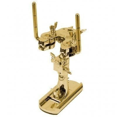 Bass drum Tom holder. For fitting two toms on a bass drum. L-tom arms with ball joint. Integrated multi clamp for attachment of a cymbal arm. Movable tom holder on bass drum. L-arm diameter 1/2“. Colour: Gold.