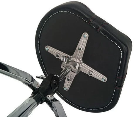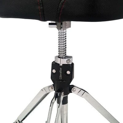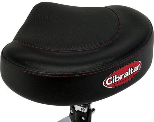 Drum throne with 2-tone compact saddle seat that measures 40 cm wide by 33 cm deep – just enough size to give ultimate comfort to the player while being compact to carry. It utilizes two styles of materials; a durable textured seat cushion material mixed with black vinyl side panel covering, with a stitched Gibraltar colour logo and red stitching highlights. The seat is built with premium foam padding contoured for added lumbar support and comfort. Other features include a rock solid double braced leg base, Super-lock cast seat fastening system, solid foundation rubber feet and a memory lock height adjustment.