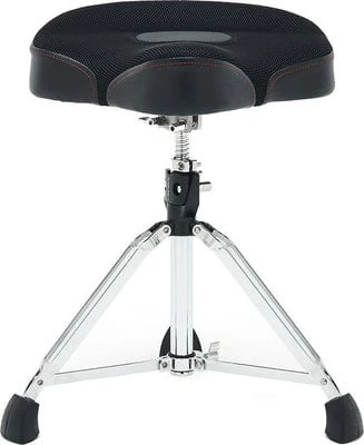 Drum stool from the 9000 series with tripod legs with double ribbing and a 43 cm diameter motorcycle saddle-shaped seat. The chair is height adjustable and has a memory lock. Made in black colour finish.