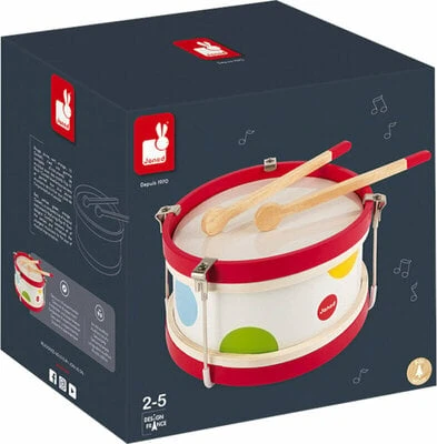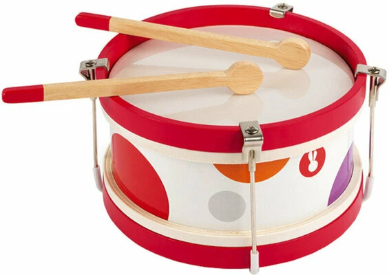 Toy drum that is suitable for children over 24 months, made of wood and synthetic skin to deliver an authentic sound. It is painted with vibrant, non-toxic paint and comes complete with two drumsticks. Dimensions: 23 x 23 x 14.5 cm. White colour design with colourful dots.