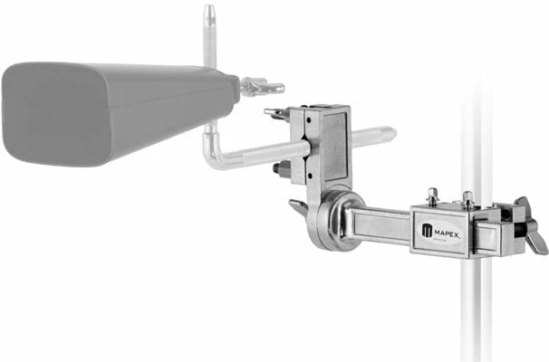 Multi angle adjustable cowbell accessory holder for cymbal stand. Simple functionality and multi-purpose adaptability allow all players to add single items to standard kits or create vast and instricate setups.