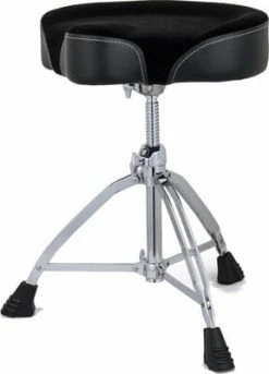 Mapex T865 professional chair with threaded seat height adjustment and with the Ultra Secure clamp / Spindle lock function to securely lock the set height. Double reinforced legs ensure stability. The massive “motorcycle” seat measuring 17×4″ made of black artificial leather/microplush provides extra comfort during long sessions.