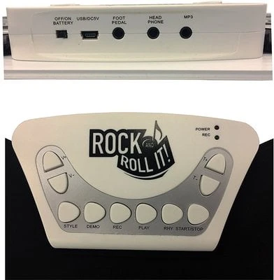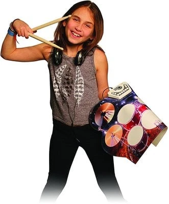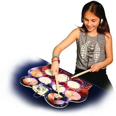Flexible and portable MIDI compatible drum set mat from Rock and Roll It series that is ideal as a practice tool for drummers or as an educational toy for children. It is made of silicon material which allows it to roll up and travel in a backpack and runs off of USB or battery power. It features 10 percussion sounds, multiple instrumental tracks to play along, record and playback function, multiple sound styles and MP3 connection. It comes supplied with headphones, drumsticks and two foot pedals (hi-hat and bass).