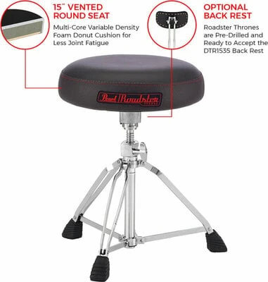 Essential for extended and efficient performance, Pearl Roadster thrones feature advanced ergonomic design and a selection of computer-tempered cushion tops to provide support and ease joint pressure during long sessions. The D-1500 features a donut-shaped Multi-Core Foam cushion, with multiple layers of varied density foam for better playing and improved feel, and its durable tripod includes Pearl’s exclusive Lock/Spin System, allowing the cushion to be secured in place or free spinning depending on preference.